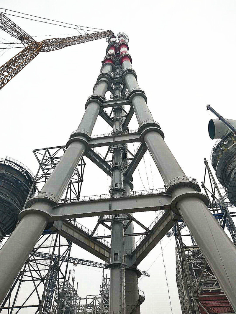 2018年12月25日上午10點10分,山鋼日照精品鋼基地2×350MW自備電廠工程三管自立式鋼煙囪第七層A、B、C筒順利吊裝就位,煙囪主體鋼結構吊裝到頂。這標志著我國第一根180米三管自立式鋼煙囪,也是首根采用內壁鈦板貼襯防腐的大型鋼管結構煙囪的落成。
